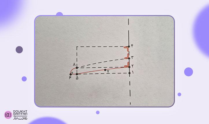 - از نقطه 3 به اندازه 5/3 تا 5 سانتی متر برای پهنای یقه بالا رفته و نقطه 4 به دست میآید.